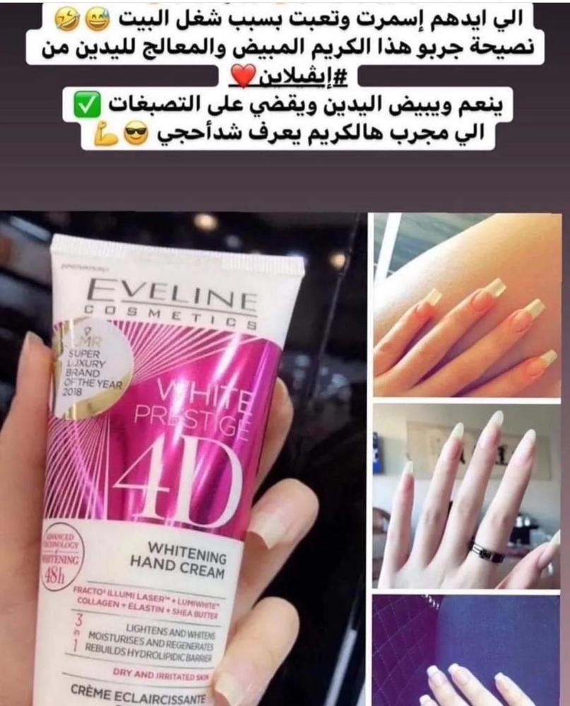 - كما يعتني الكريم ببشرة اليدين بفعالية حيث يعمل على تجديدها بشكل فوري.